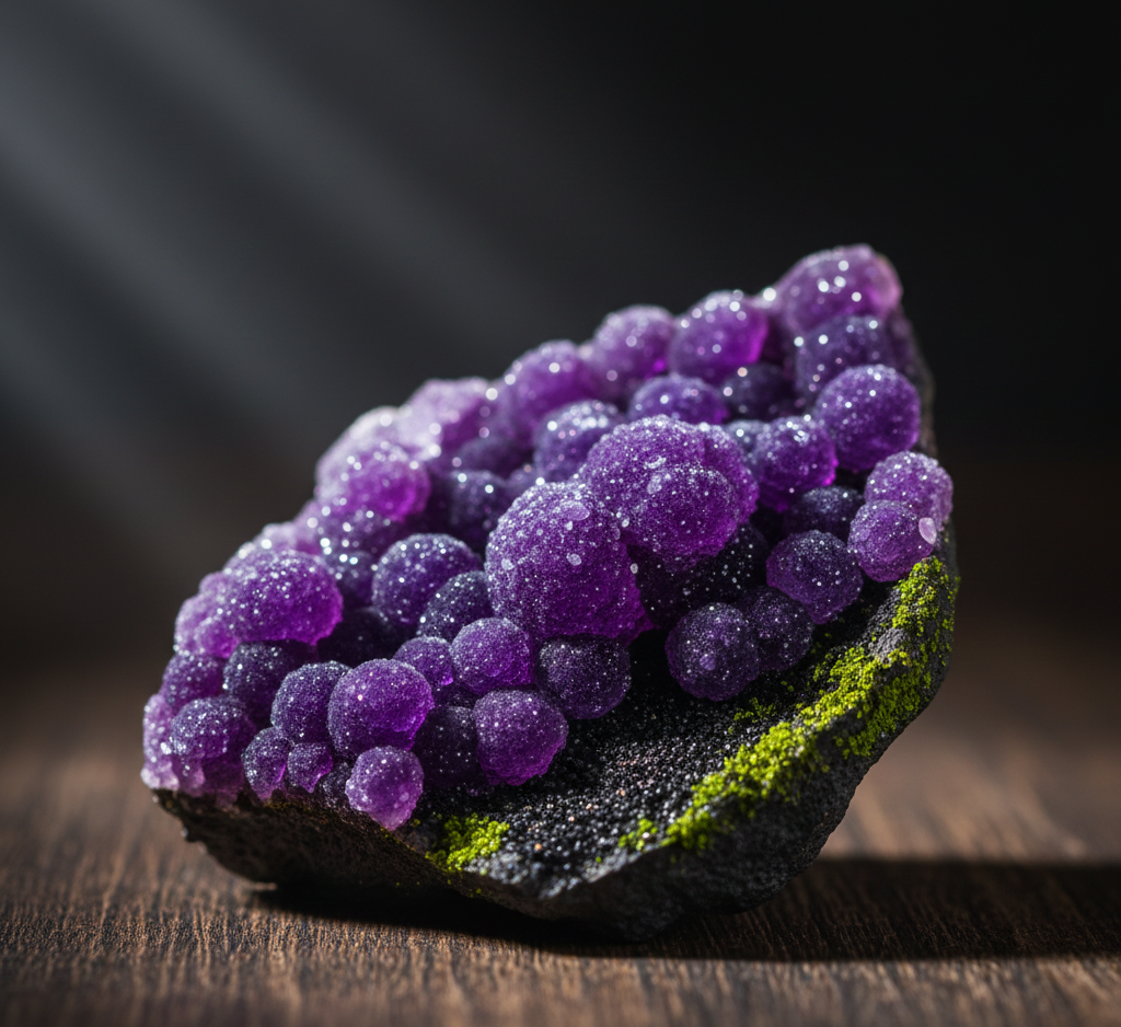 This stunning Grape Agate Cluster displays tightly packed, naturally formed purple spheres resembling tiny grapes, creating a mesmerizing and unique texture. Known for its soothing and intuitive energy, grape agate helps deepen meditation, enhance spiritual awareness, and promote emotional balance. Its vivid color and rare formation make it highly sought after by collectors and crystal enthusiasts. Perfect for display, energy work, or gifting, this piece radiates gentle serenity while adding striking beauty to any crystal collection.