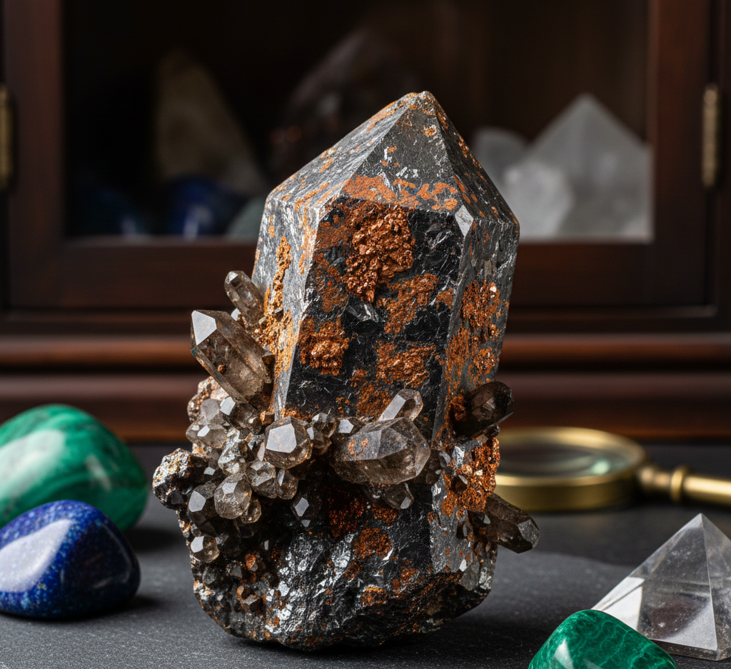 This striking specimen showcases a prominent smoky quartz point coated with vibrant reddish hematite, giving it a dramatic, earthy contrast. Surrounding the main crystal are clusters of translucent smoky quartz points, adding depth, texture, and sparkle. The interplay of metallic hematite and smoky quartz creates a rugged yet elegant aesthetic prized by collectors. Ideal for display, energy work, or décor, this piece offers grounding presence, visual impact, and a unique mineral combination that highlights nature’s raw beauty and crystal artistry.