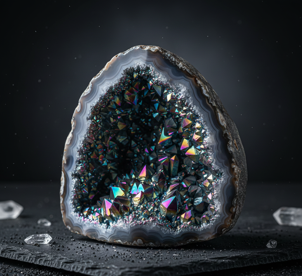 This breathtaking Titanium Aura Agate Geode showcases brilliant rainbow-colored crystals created through a natural agate base enhanced with titanium bonding. The result is a dazzling metallic sheen that catches light from every angle, making it an eye-captivating centerpiece. Ideal for home décor, meditation spaces, collectors, and premium crystal displays, this geode offers both beauty and energetic balance. Each piece is uniquely shaped with layered agate bands and sparkling crystal formations, ensuring exceptional quality and visual impact for any stone collection.